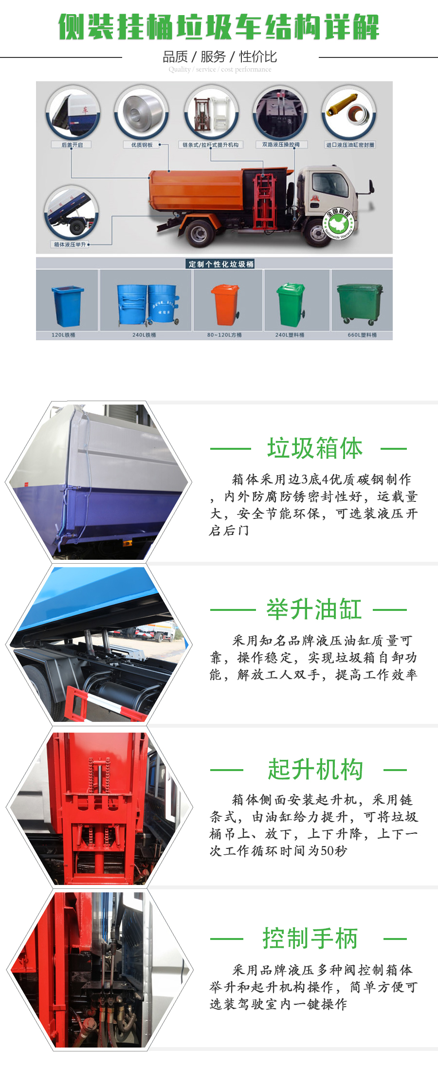 挂桶式垃圾车(自装卸式垃圾车)是由密封式垃圾厢、液压系统、操作系统组成,可配套全国通用铁桶和塑料桶。一台车能配几十个垃圾桶,能实现车、桶联合作业,循环运输,自动提升架可将垃圾桶吊上、放下,上下升降,上下一次工作循环时间为60S,密封式厢体环保卫生,可避免二次污染。