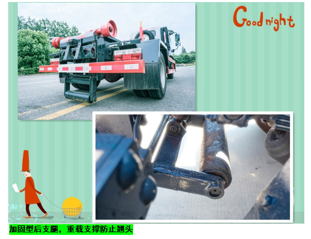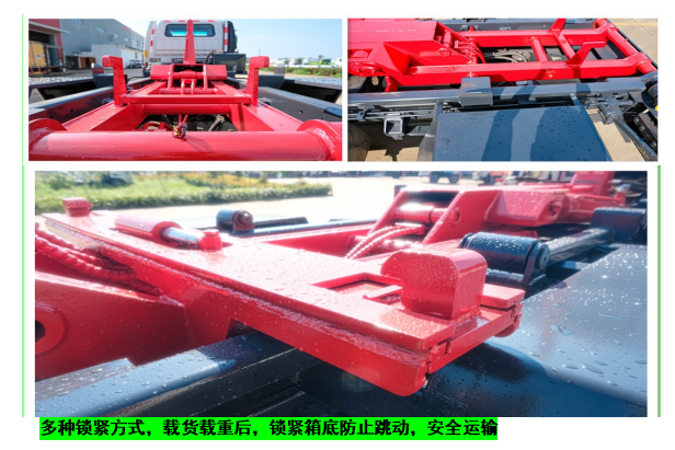◇上装配置:强度合金钢一体式主勾臂,加强型副梁,铸钢尾托轮,手自一体室内外液压操控,上装提升能力3000KG, 液压完成上箱+下箱+锁紧+自卸等作业,实现一车配多箱的循环转运。可采用加强型上装,油缸加粗,加装液压支腿,搭配建筑垃圾箱使用,提升能力8000Kg。