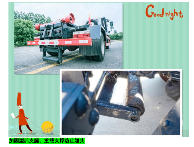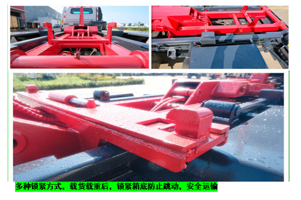 ◇上装配置:强度合金钢一体式主勾臂,加强型副梁,铸钢尾托轮,手自一体室内外液压操控,上装提升能力3000KG, 液压完成上箱+下箱+锁紧+自卸等作业,实现一车配多箱的循环转运。可采用加强型上装,油缸加粗,加装液压支腿,搭配建筑垃圾箱使用,提升能力6000Kg。