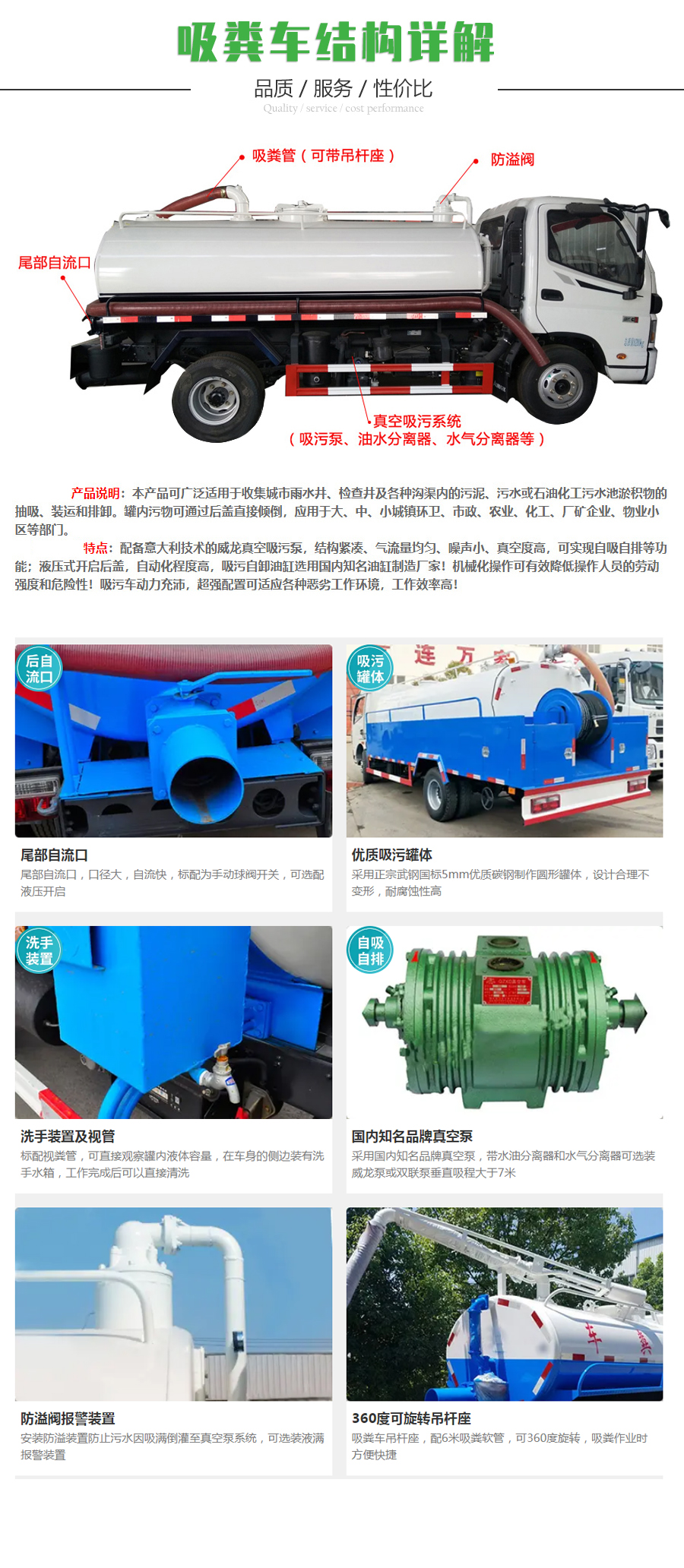 【选装配置】选装进口真空吸粪泵、水循环泵,选装不锈钢罐体,罐体防腐、聚乙烯衬塑处理。加装抽水泵可具备洒水车部分功能,用于园林绿化、环卫保洁洒水作业。
