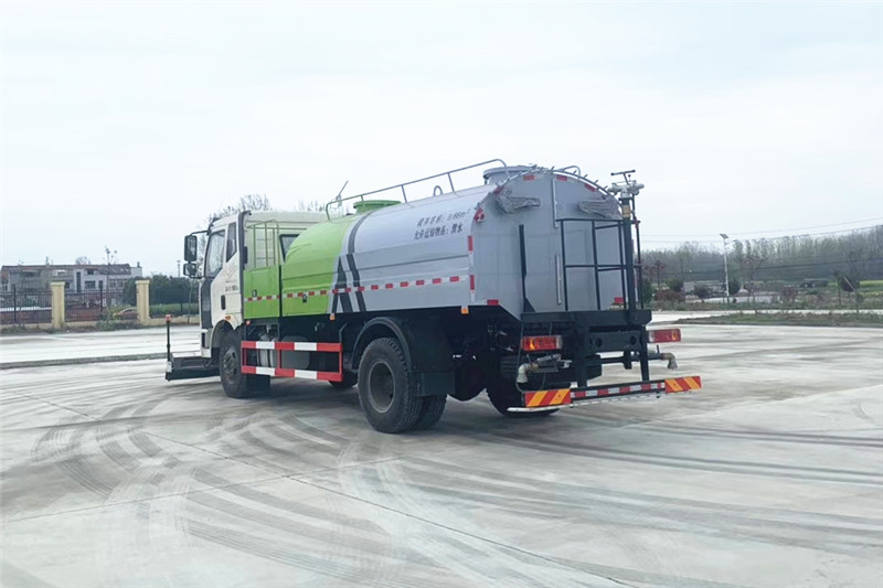 高压水泵由副发动机→传动轴→皮带传动→电磁离合器→联轴器驱动;低压水路系统,采用双级叶轮离心泵,效率高、洒水宽度大、水枪射程远,低压水泵由底盘变速器取力器通过传动轴直接传动。