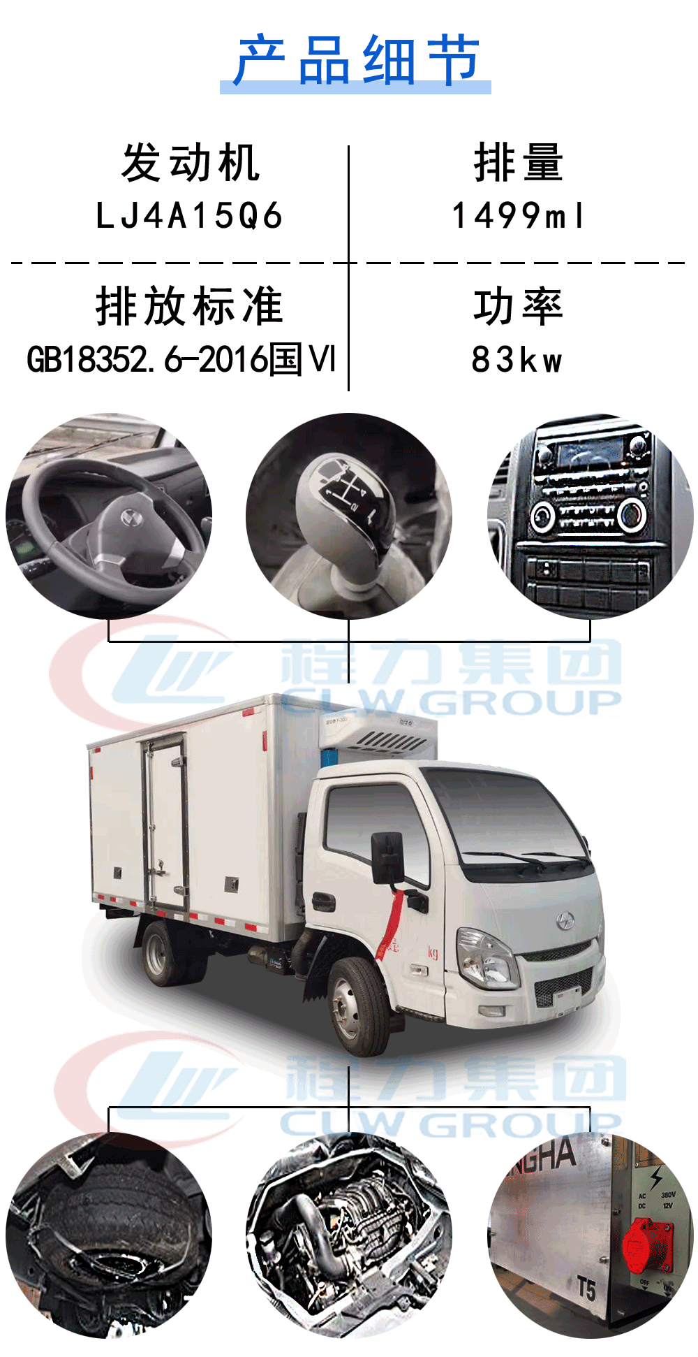 | 其他 | 1.ABS控制器型号/生产厂家:YF8/武汉元丰汽车电控系统有限公司;2.LJ4A15Q6净功率为79kw,对应油耗值为9.6L/100km;3.车厢顶部封闭不可开启;4.车厢可选装不开门或侧开门,可选装左或右侧开门,不同外观侧门和后门;5.可选装导流罩;6.选装其他厂家功率相当的制冷机组,KV300英格索兰(中国)投资有限公司,K125劲达技术(河源)有限公司,MK358劲达技术(河源)有限公司;7.冷藏车类别:F类;8.随底盘选装驾驶室前围面板,前围格栅,后视镜,前部灯具,前保险杠外观,扩展轮辋外观,扩展轮眉,随底盘选装排半驾驶室;9.驾驶室左侧车门选装装饰标贴. | ||