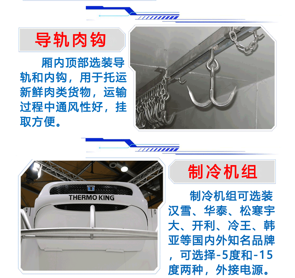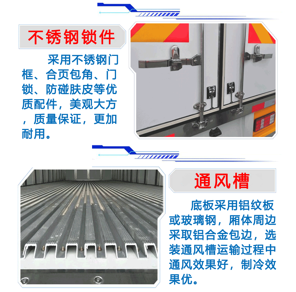上装配置:箱体为内外玻璃钢板,中间保温材料为8cm聚氨酯保温板,铝花纹底板,箱体铝合金型材包边,包角,配双开后门,单开侧门,不锈钢门框、锁件、铰链,其余