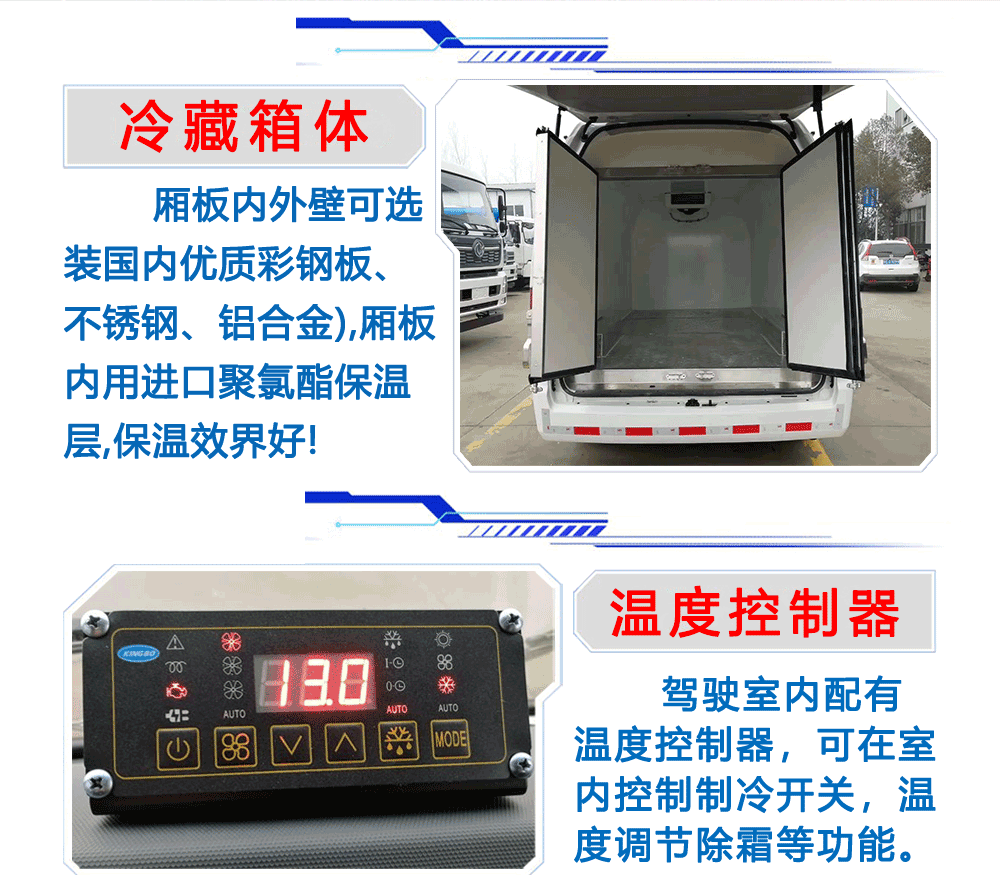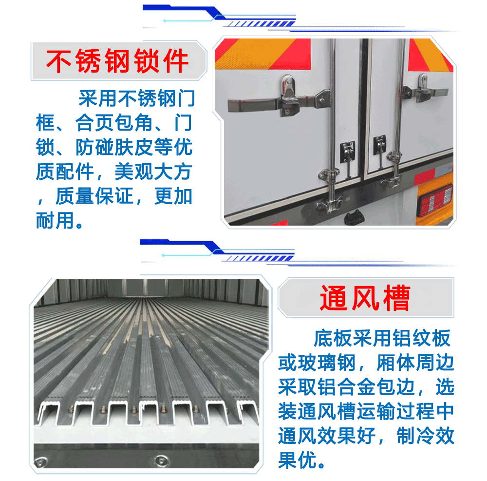 箱体一般标配内外采用2.2mm优质玻璃钢材质,中间8cm聚氨酯发泡保温层,厢体底板材质采用花纹防滑铝底板,配不锈钢门锁件。